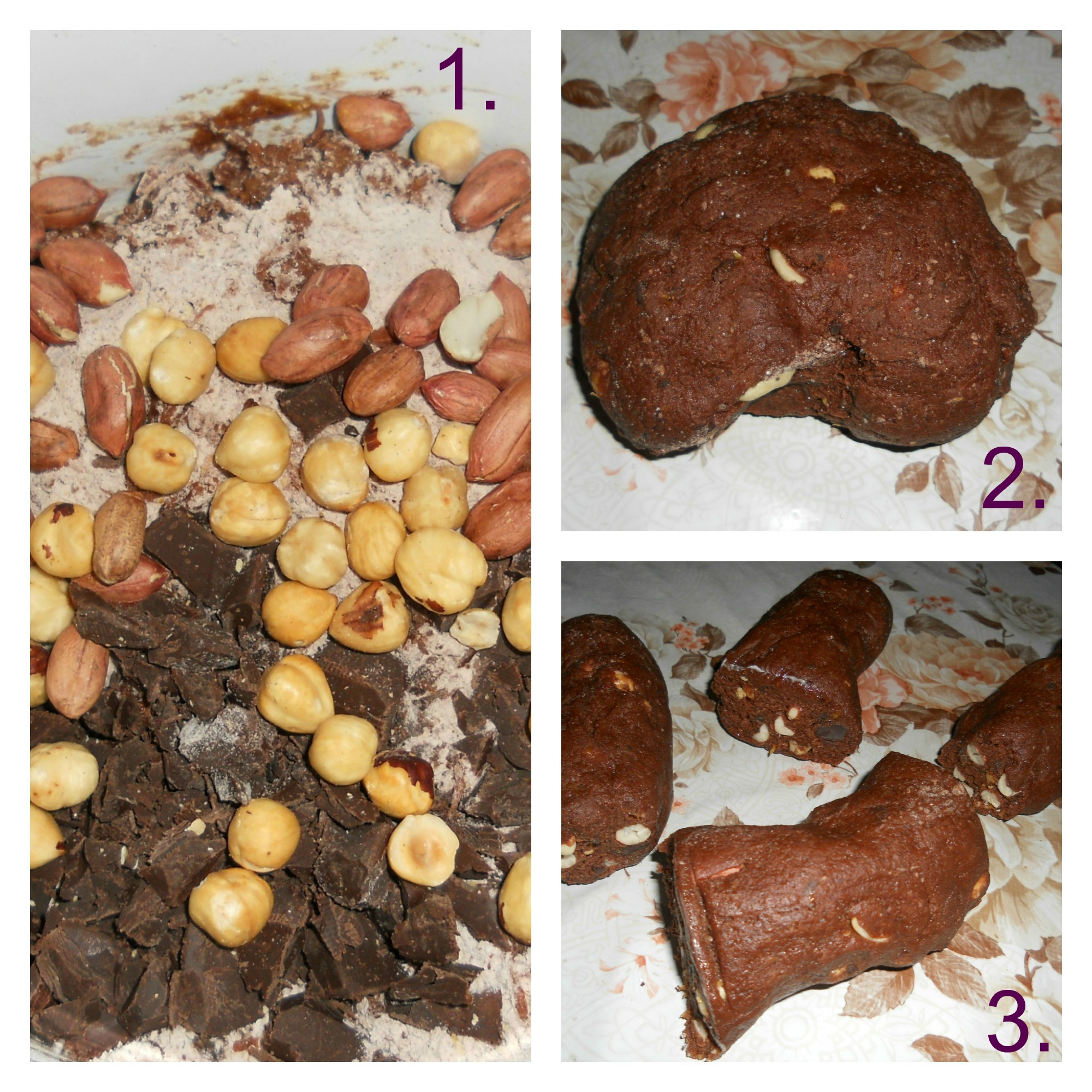 2.   Făina, praful de copt, sarea,  zahărul, cacaua, scorţişoara, alunele şi ciocolata se amestecă într-un castron (pasul 1). Se adaugă ouăle bătute şi zahărul vanilat. Se amestecă bine, formând o compoziţie omogenă (aluatul) – pasul 2.
